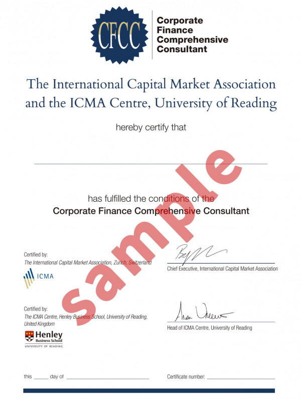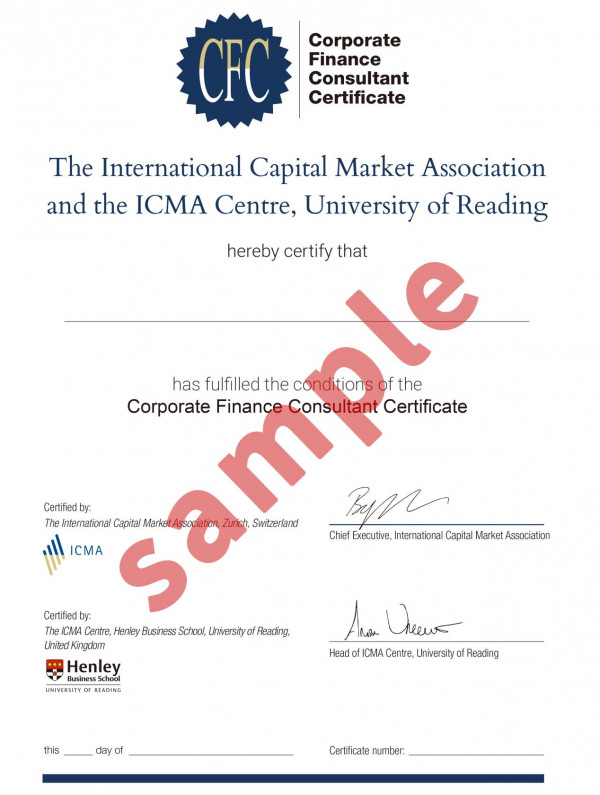The education and certification system for Corporate Finance Consultants (CFC) includes the following three levels: Corporate Finance Comprehensive Consultant (CFCC), Corporate Finance Consultant (CFC), and Corporate Finance Specialist (CFS). These certificates are issued by the International Capital Market Association (ICMA) and the University of Reading. As of December 2024, 50,000 candidates worldwide had obtained CFC certification through examination or exemption.