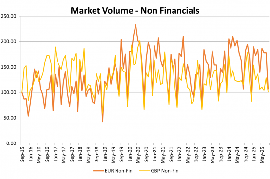 The market volume evolution represents the changes in the monthly aggregate volumes of all observed trades in securities in the relevant group, based to 100 as at September 2015. EUR Financials include approximately 4000 securities, GBP Financials 1500, EUR Non-Financials 3000, and GBP Non-Financials 1000.